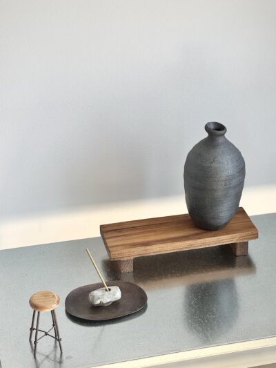 Handmade black ceramic tray from Japan. Its organic textures reflect the light and shadow, perfect for showcasing accessories, plants, or other personal items.